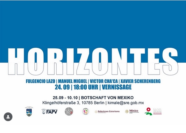 Horizontes . Ausstellung von Fulgenzio Lazo, Manuel Miguel, Victor Cha´Ca und Xavier Scherenberg, bis 10.10.2025. Eröffnung am 24.09.2025, 18 Uhr, in der Mexikanischen Botschaft, Klingelhöferstr. 3, 10785 Berlin.